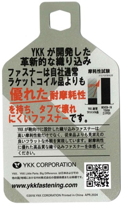 ファスナーは、YKKです。